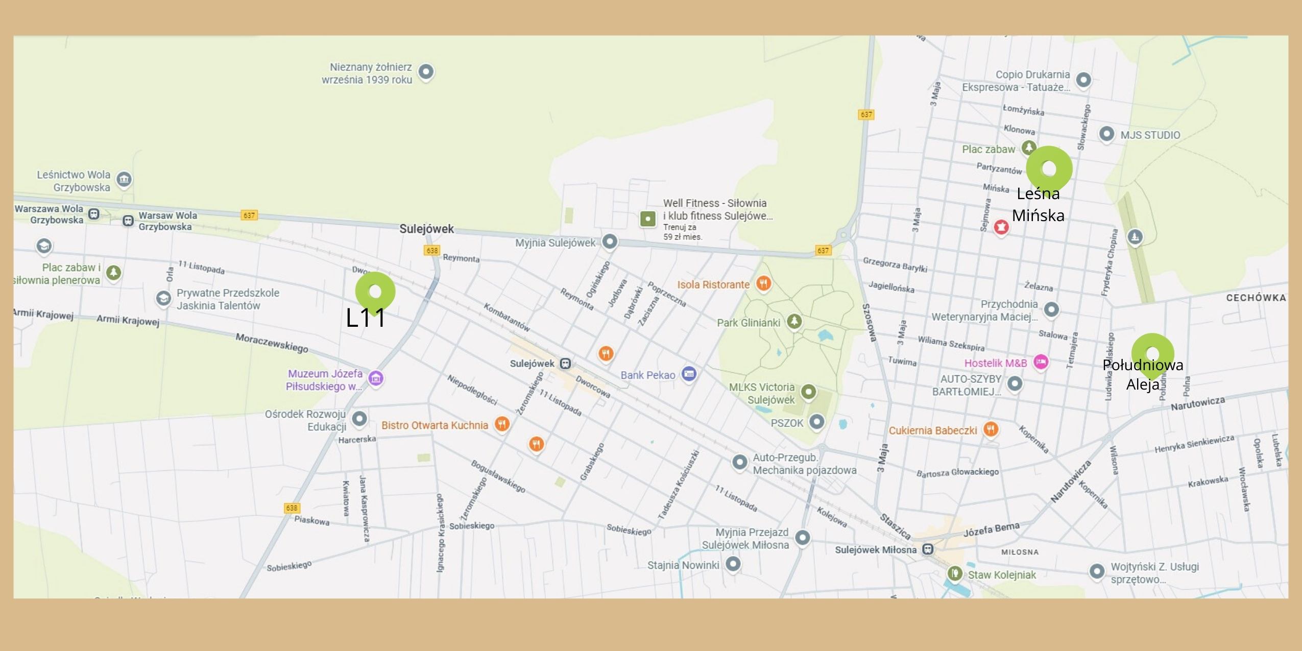 Najkrótsza droga do Warszawy spośród naszych lokalizacji – zaledwie 800 m od granic Warszawy Wesołej.