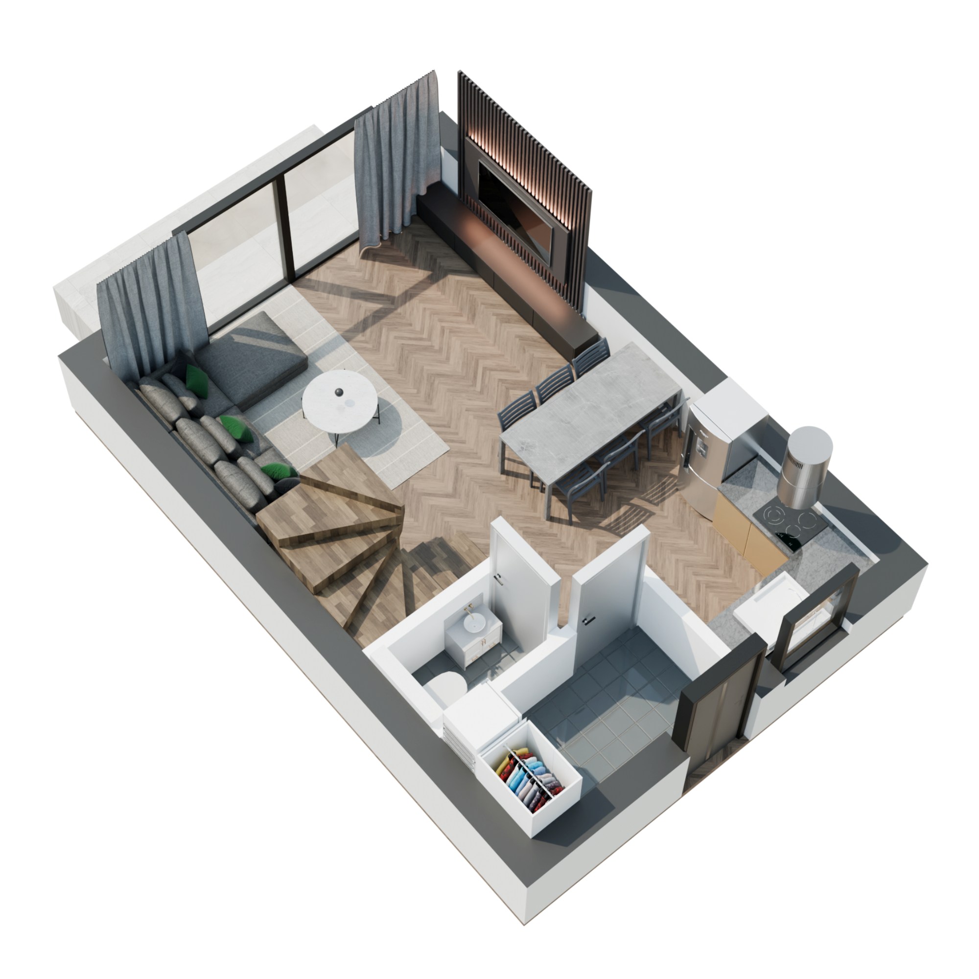 Wizualizacje lokali i terenów zewnętrznych mają charakter poglądowy i nie stanowią oferty w rozumieniu Kodeksu cywilnego. Przedstawione meble, układ pomieszczeń oraz aranżacja terenów zewnętrznych nie są częścią oferty ani cen mieszkań.