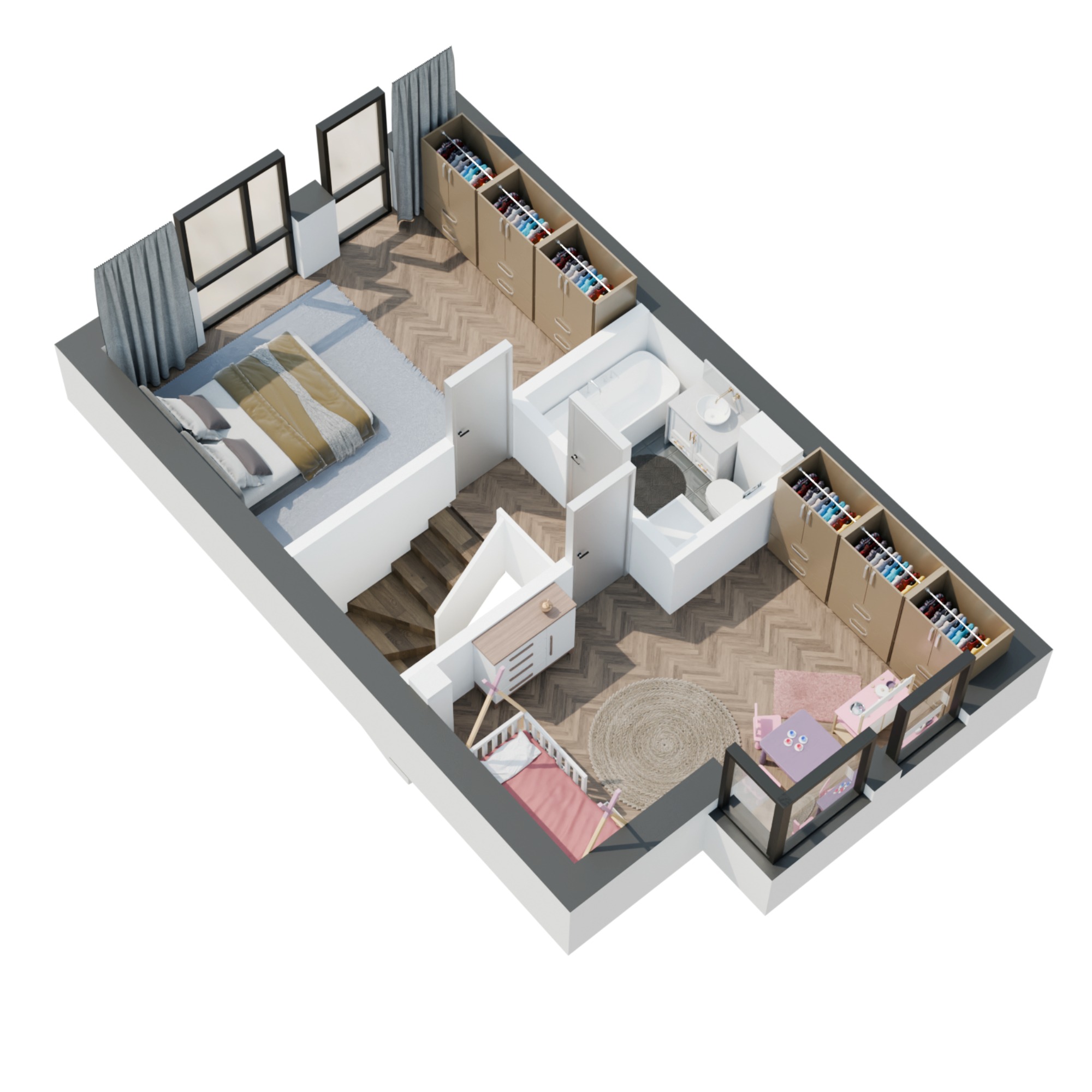 Na piętrze znajduje się strefa prywatna – dwa duże, pełne naturalnego światła pokoje, które można zaaranżować jako sypialnie, pokój dla dzieci lub domowy gabinet. Duże okna wpuszczają do wnętrza mnóstwo światła, nadając pomieszczeniom lekkości i przytulności.