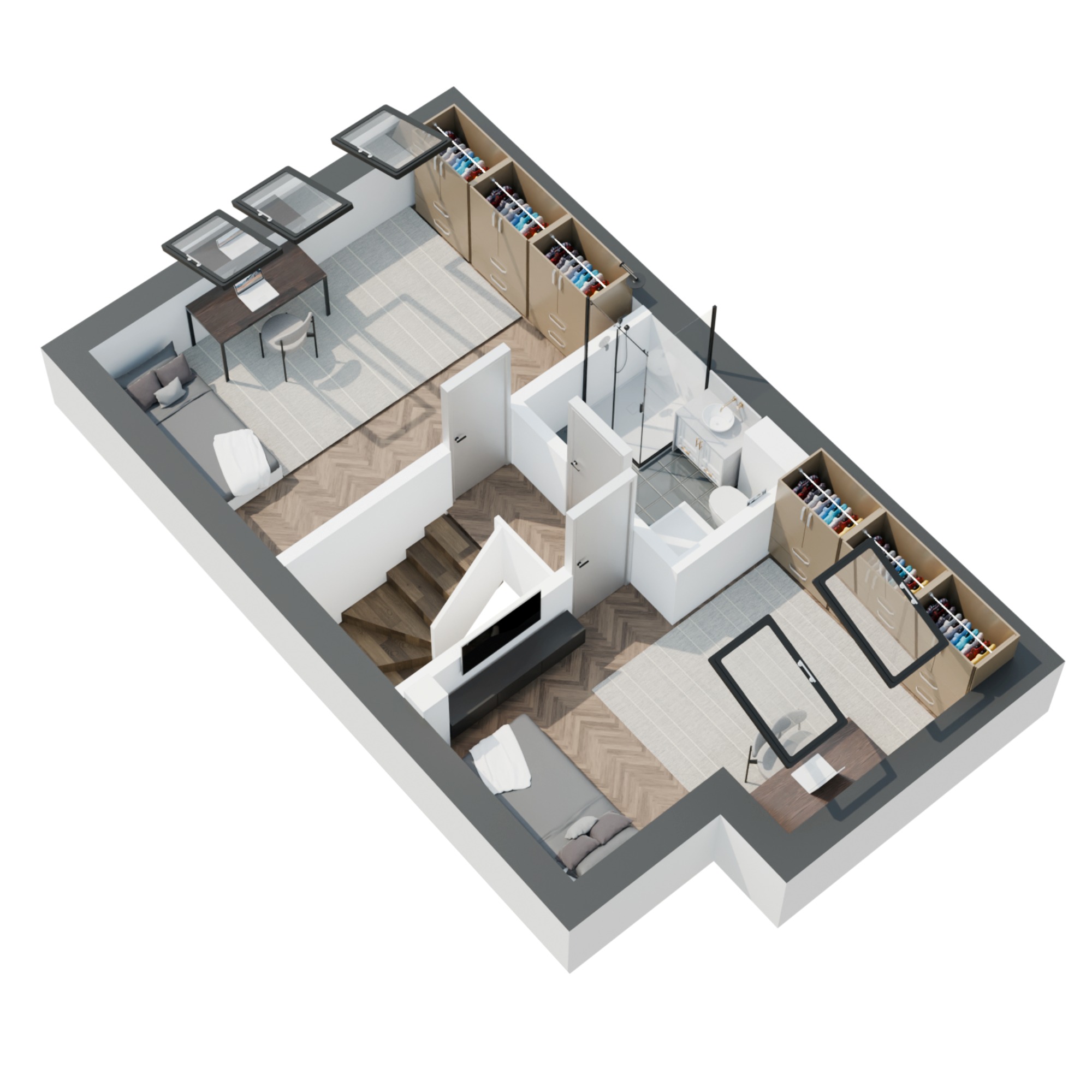 Centralnym punktem tego poziomu jest nowoczesna łazienka. Jej przestronność umożliwia umieszczenie dużej wanny, zapewniając idealne warunki do relaksu po intensywnym dniu.